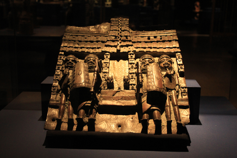 El latón europeo, que mediante el comercio con Portugal llegó en grandes cantidades a Benín, se convirtió en la base del desarrollo del arte cortesano de este reino que produjo arte en latón fundido como ninguna otra sociedad africana de la época. Producidas por un gremio de artesanos reconocidos, que forman parte del palacio, su técnica y tradición se traspasaba por herencia dentro del grupo. Entre las piezas de este tipo destacan las placas de alto relieve, representación por excelencia del poder real. El resplandor de estas placas pulidas con regularidad, convertía los patios de los altares en el destacado y “rutilante” centro del palacio y, con ello, del reino. Reflejaban la totalidad del cosmos, con el mundo del rey, de la corte con sus ceremonias, dignatarios, sacerdotes y jefes militares, pero también los simples sirvientes.