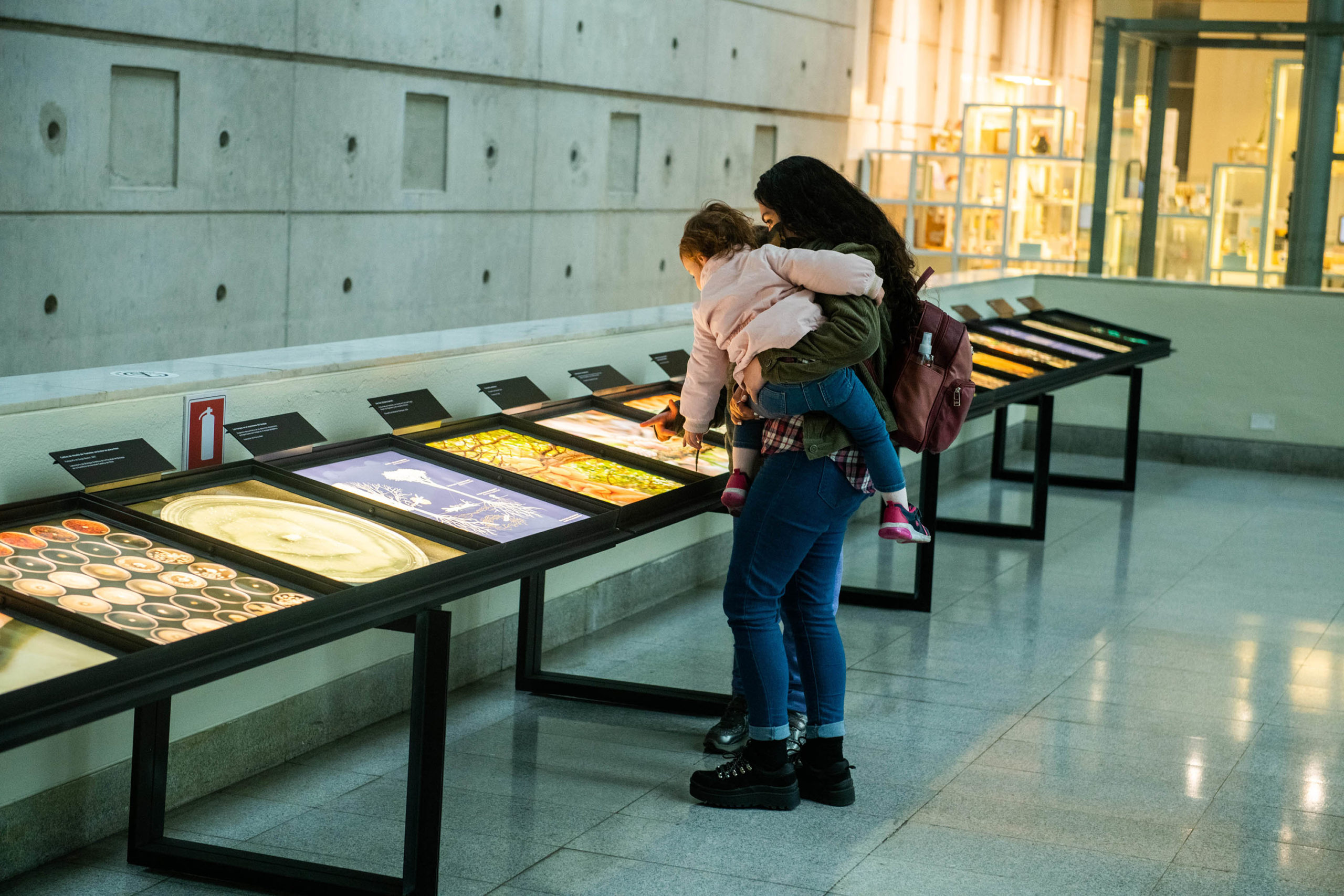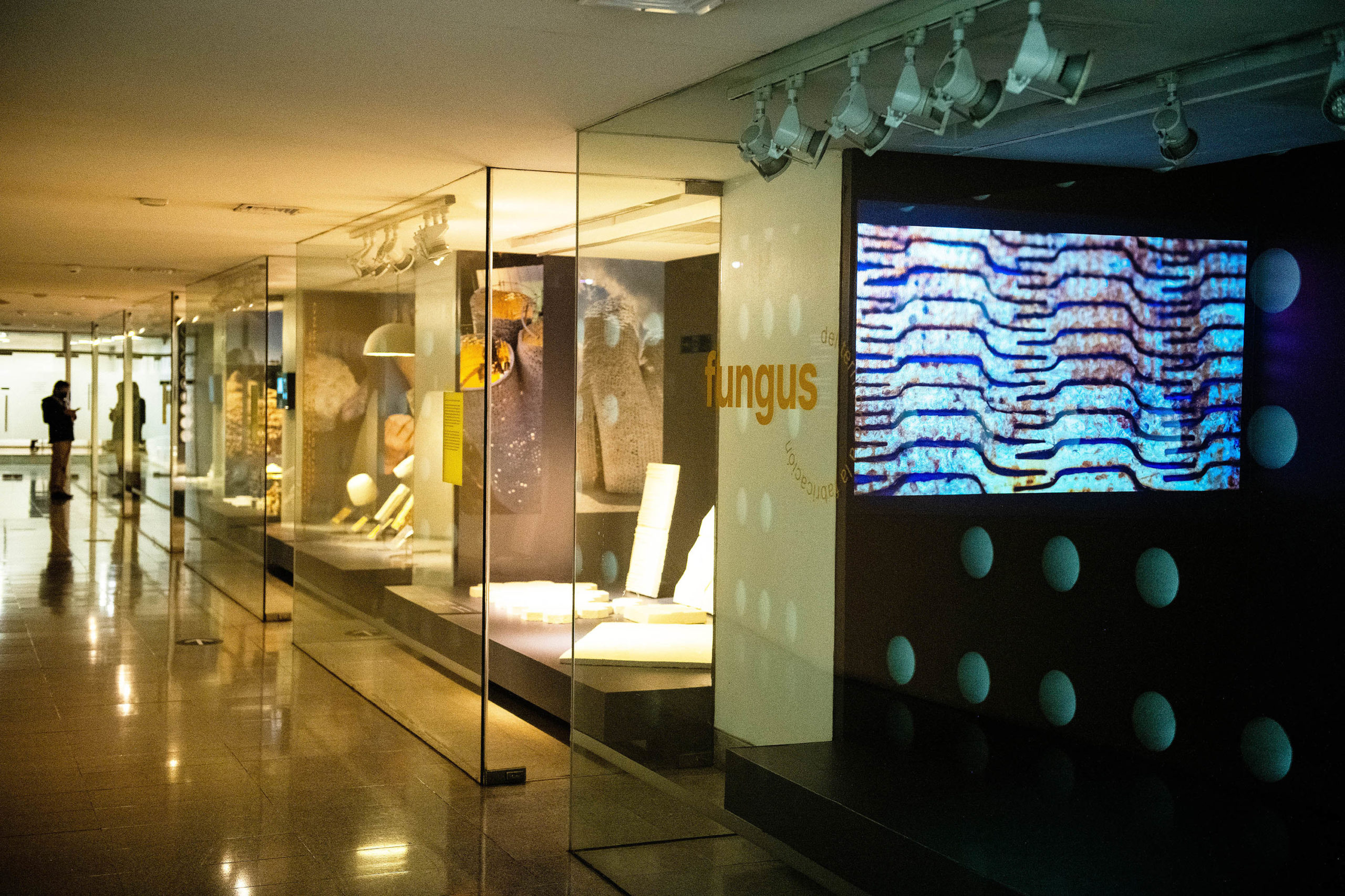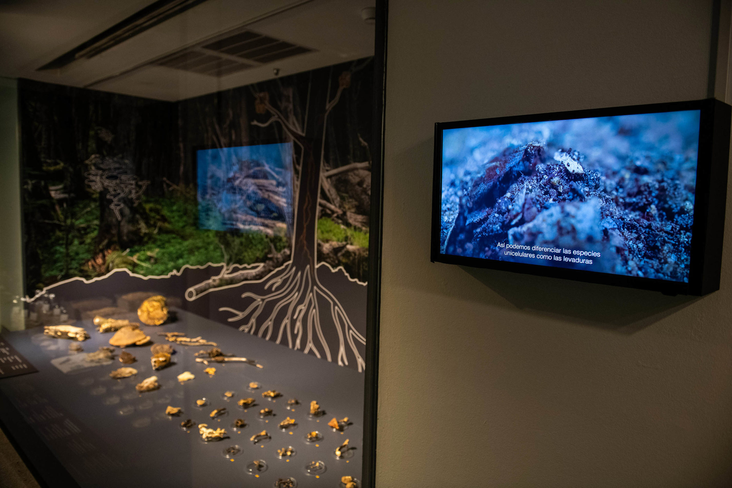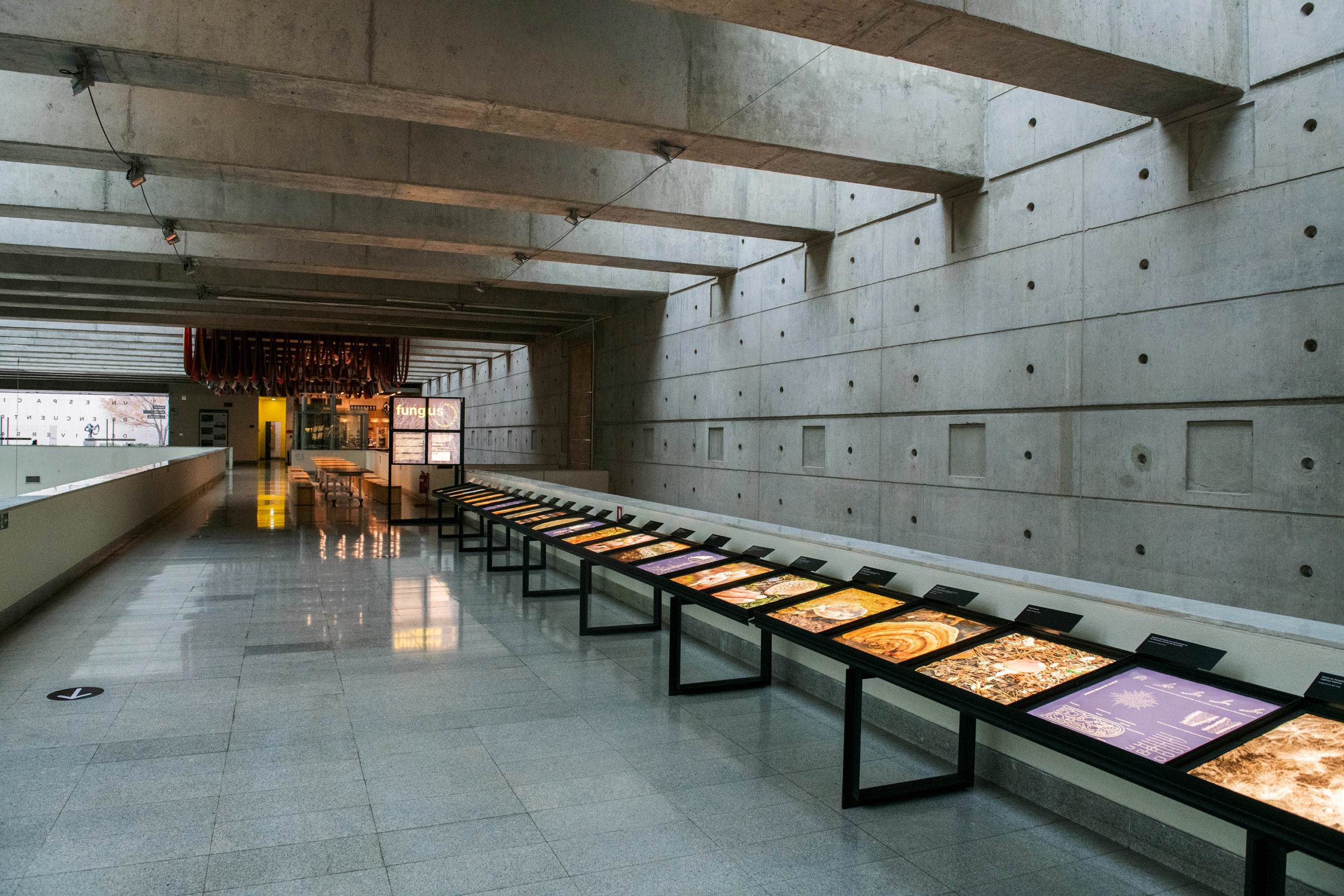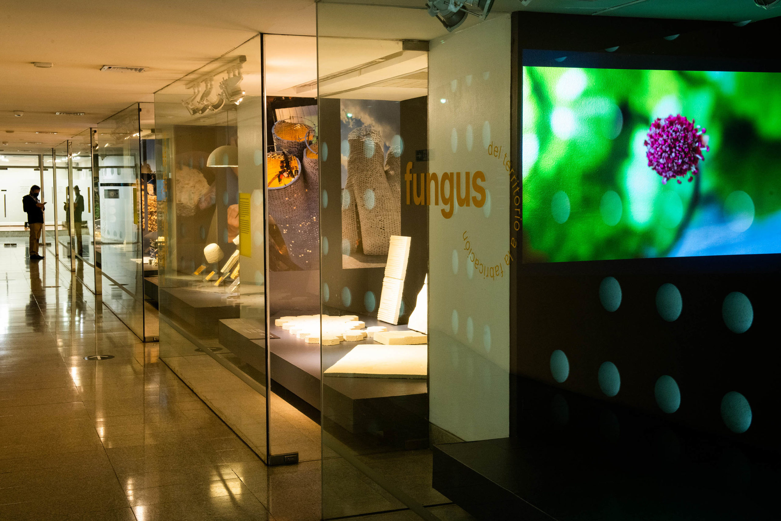 En paralelo, en el Nivel -1, en el Espacio Wiphala, se presenta una exposición sobre el trabajo con hongos en diferentes escalas, con fotografías, diagramas e ilustraciones que dan cuenta del territorio, el objeto y el proceso productivo.