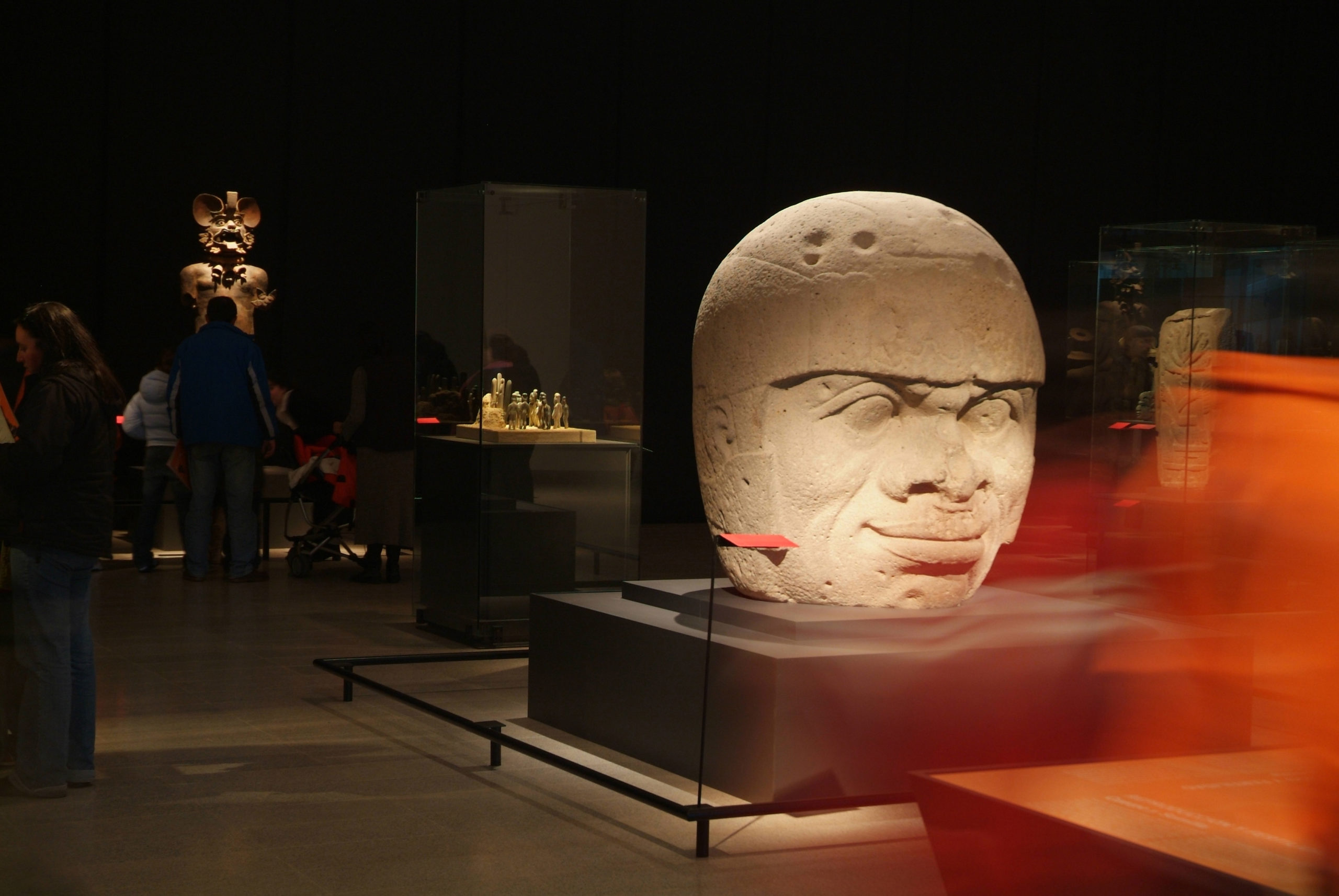 Una de las obras más impactantes, por su dimensión e historia, es la “Cabeza olmeca” que ha sido expuesta solo una vez con anterioridad en Francia. Procedente de San Lorenzo, Tenochtitlan, la cabeza de basalto de 1,65 metros de altura y 1,36 metros de ancho, pesa 5 toneladas. Con una data aproximada del 1500 AC, pertenece al Museo de Antropología de Xalapa.