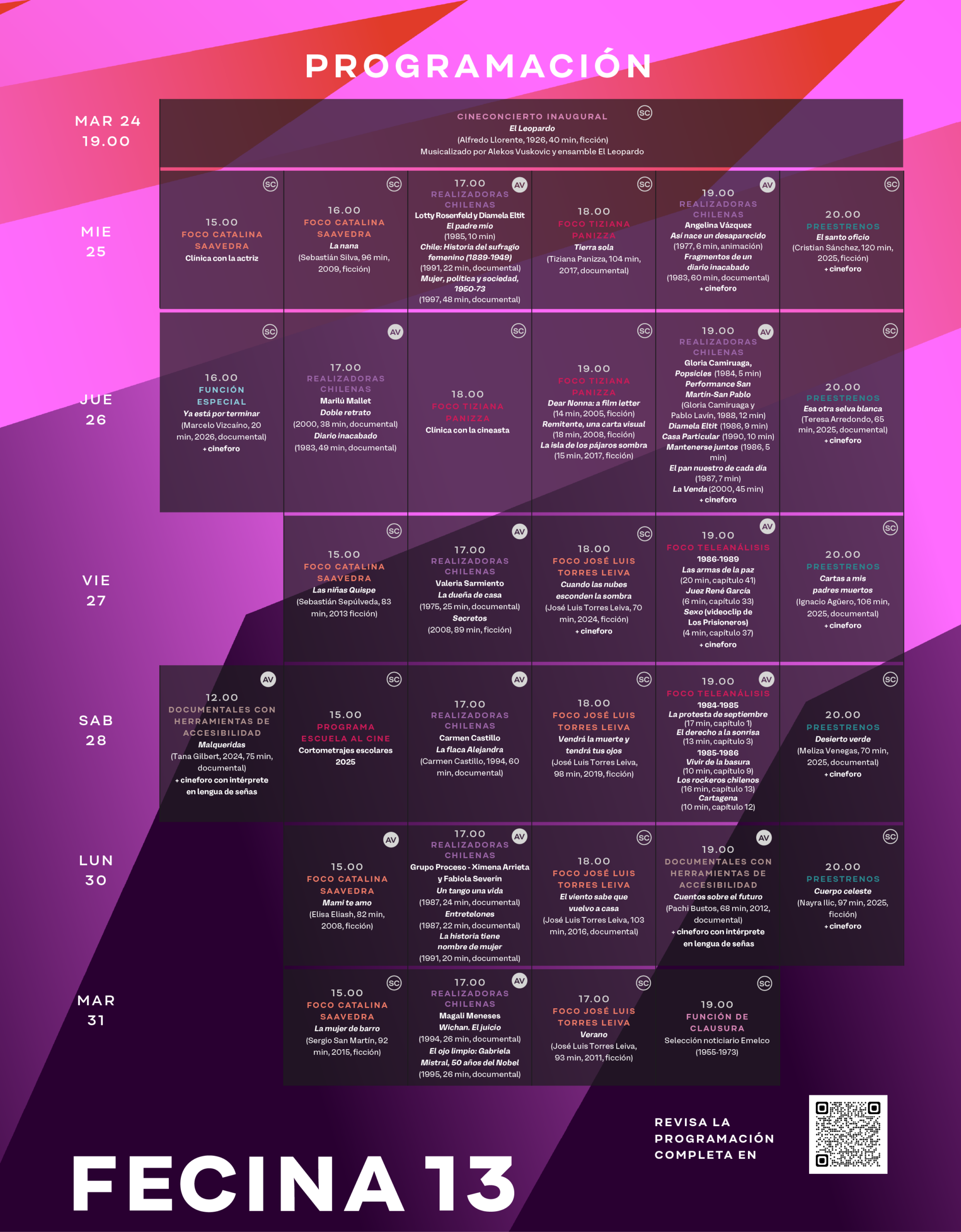 24 al 31 de marzoLa Cineteca Nacional de Chile presenta la décimo tercera versión de su festival FECINA, con más de 30 películas en distintas franjas, acompañadas por actividades especiales como talleres, clínicas, diálogos y cineforos.